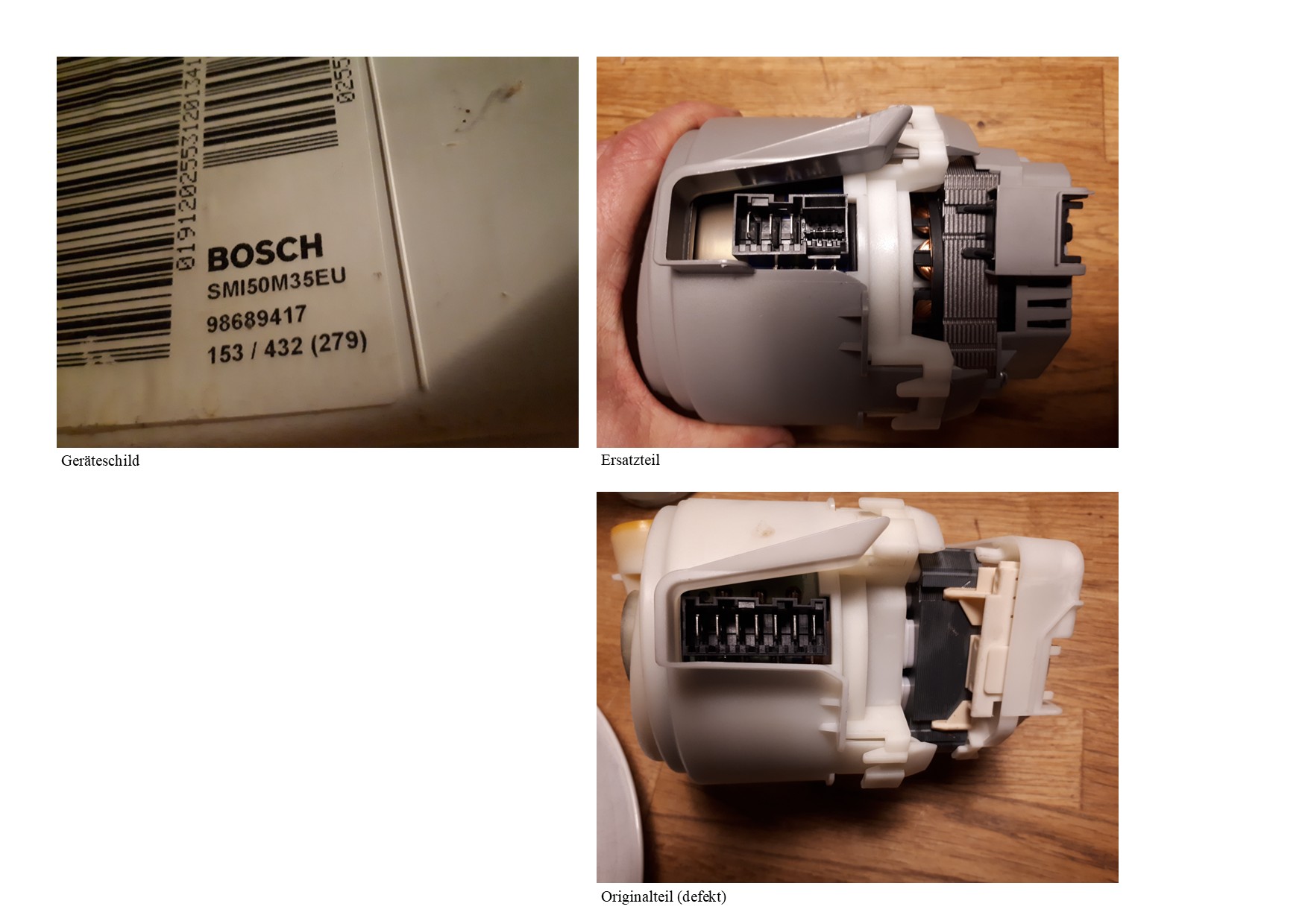 bei meinem Geschirrspüler SMI50M35EU von 2009 ist die Heizpumpe 9000.437089-P0006 kaputt, und ich möchte sie wechseln. Offenbar gibt es mehrere Varianten des Geschirrspülers 01, 21, 24, usw. allerdings steht auf meinem Geräteschild an der Geräterückseite keine Variantennummer bzw. ist das eigentliche Typenschild unleserlich. Habe mir daher die Heizpumpe mit Kabelsatz für 01 bestellt und leider festgestellt, dass die Anschlüsse nicht passen. Ist der Kabelsatz als Adapter gedacht?