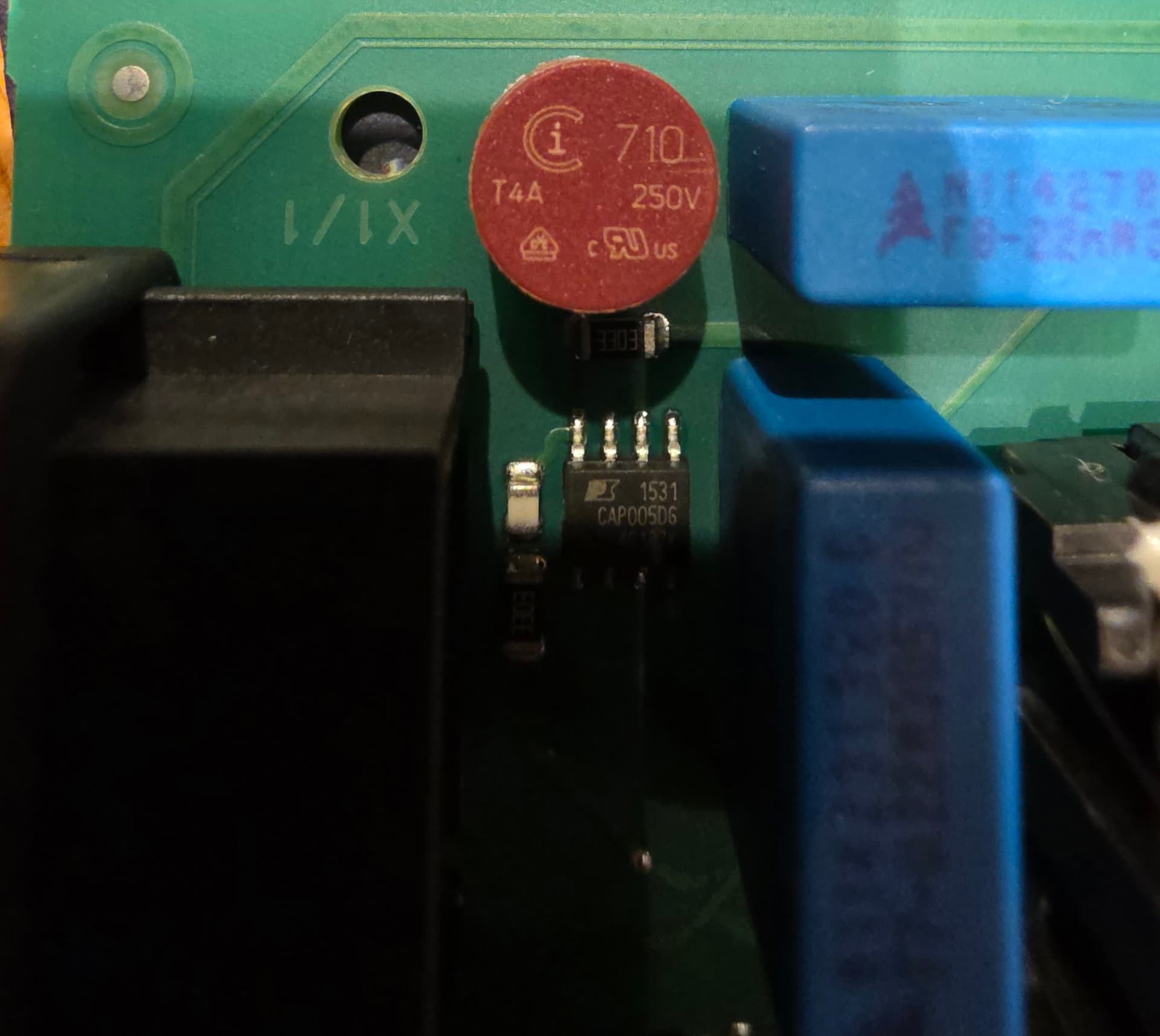 Leider habe Ich keine Sicherung finden können. Hier noch ein Bild von der Platine. Auf der Rückseite finden sich noch so Beläge, entweder doch ein Schaden durch Feuchtigkeit? Korrosion oder altes Flussmittel?